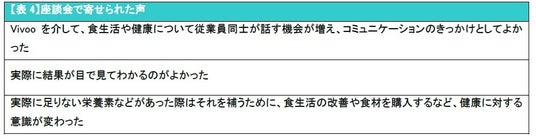 事業実施期間中に食生活や健康に関して従業員同士の会話が増えたかどうかを聞いたところ、8割以上の事業所が「そう思う」と回答しました【図3】。また、そう思った背景には「Vivooの結果の点数等を職場で話す機会があった」や「普段の食生活を見直すきっかけになった」などの声がありました【表1】。