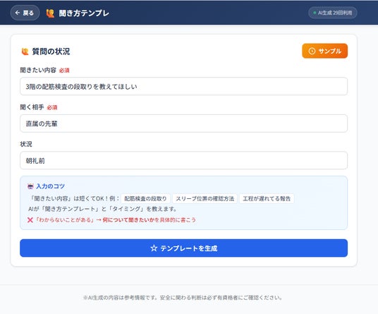- 日報自動生成──箇条書き5項目を入力するだけで、上司に見せられる品質の日報を30秒以内に生成。施工管理の日報に求められる記載項目(天候、作業内容、人員配置、安全事項、翌日予定)を自動で構造化します。