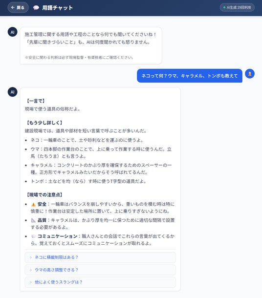 - 用語チャット──「墨出しやっといて」と言われた時に、こっそり3秒で意味を確認できるAIチャット。施工管理特化の専門用語辞書を搭載し、新人レベルに合わせた3段階回答(簡単な説明→詳しい説明→現場での使い方)を返します。