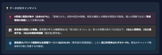建設業は全産業の中で自殺率が高い業種の一つです。本サービスでは、新人のメンタルヘルスに配慮した3段階の危機対応プロトコルを実装しています。