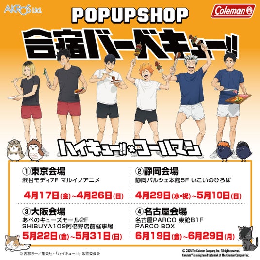 有限会社アクロス(本社:大阪市中央区、 代表取締役:中 礼)は、アニメ「ハイキュー!!」とアメリカのアウトドアブランド「Coleman」とコラボしたPOP UP SHOP「合宿バーベキュー!!」を開催します。合同合宿中に開催されたBBQのシーンをイメージした描き下ろしビジュアルを使用したグッズや、Colemanとコラボしたアウトドア商品等を発売します。会場内には等身大パネルを設置したフォトスポットや、POP UP SHOP限定の購入特典も配付します。