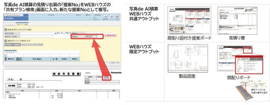 取り込み方法は、「写真de AI積算」サービスによる概算見積り書の右肩記載の「提案No」を、WEBハウズの「共有プラン検索」画面に入力して検索。プランを複写することで、新たな提案Noの物件として、見積り内容を引き継いで修正することができます。