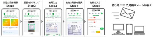 写真de AI積算は、紙図面をスマホで撮影し依頼操作をするだけで約5分(※1)で概算見積りが届くサービスです。スマホで見積り依頼が可能なので、外出先でもパソコンを立ち上げることなく、その場で現場図面をスマホで撮影して積算依頼が可能。これまでの「日中は現場、夜に積算」といった時間の使い方の改善や、スピーディな提案活動に貢献します。操作は5つのステップ。間取り図をスマホで撮影した後、図面をトリミング、縮尺や物件名を入力して依頼完了。指定したメールアドレスに約5分(※1)で概算見積りが届きます。