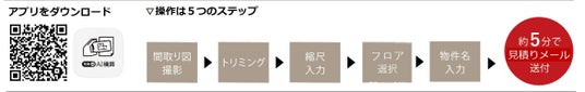 今回新たに、AIによる積算機能をより多くの人が使えるように、スマホのアプリストアでダウンロード可能な「写真de AI積算」サービスの提供を開始しました。Newベリティス受注開始に合わせ、2026年4月1日よりアプリストアに公開しています。ダウンロード後の操作は5つのステップ。間取り図をスマホで撮影した後、図面をトリミング、縮尺や物件名を入力して依頼完了。指定したメールアドレスに約5分(※1)で概算見積りが届きます。スマホで見積り依頼ができるので、営業担当者が得意先訪問時、見積り依頼を受けて活用するなどで時間短縮に貢献。また、従来の「間取り図AI積算」機能付きの積算システム(WEBハウズ)へ連携し、見積り内容を取り込めるので修正変更も可能(※2)です。「写真de AI積算」で概算見積りを行い、その後に積算担当者はチェックと従来システムでの修正をするといった活用で、積算業務の効率的運用にも貢献します。