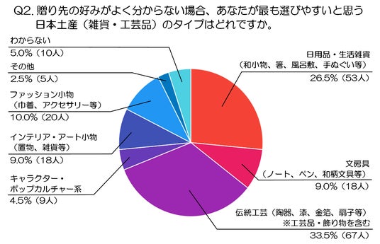 - 次いで多かったのが、「日用品・生活雑貨(和小物、箸、風呂敷、手ぬぐい等)」の26.5%(53人)でした。毎日の暮らしの中で使いやすいものは、実用性があり、相手にも受け入れられやすい傾向があります。和の雰囲気を感じられながらも、日常になじみやすい点が魅力であり、気負いすぎずに贈れるジャンルとして支持されていることがうかがえます。