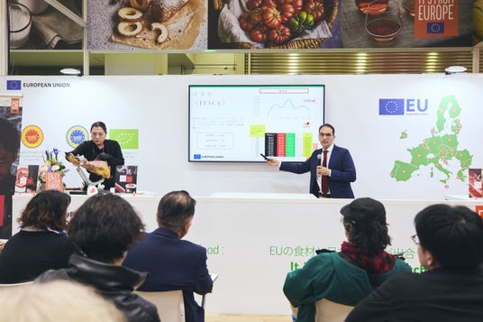 展示会期間中の取り組みの一環として、ASICIは欧州連合(EU)パビリオンで開催されたイベントにも参加し、同協会ジェネラルディレクターであるヘスス・ペレス・アギラルが、FOODEXに来場した専門家向けにイベリコハムのガイド付き試食を実施しました。