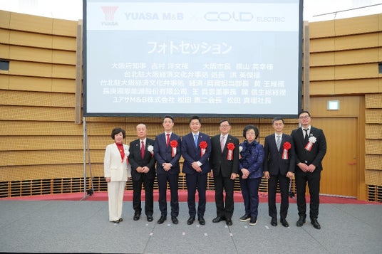 (左側よりユアサM&B株式会社松田真理代表取締役社長兼CEO、ユアサM&B株式会社松田憲二会長、大阪市・横山英幸市長、大阪府・吉村洋文知事、台北駐大阪経済文化弁事処・洪英傑処長、COLD ELECTRIC王貴雲董事長、台北駐大阪経済文化弁事処・経済商務黄王維担当部長、COLD ELECTRIC陳信生執行長CEO)