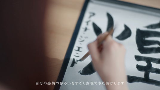本ムービーの舞台は、あえて「和室」という書道らしい固定観念を離れた空間で、アイナ・ジ・エンドさんが筆と墨と半紙だけで自分自身と対峙します。好奇心あふれる前のめりな姿勢から、徐々に感覚が研ぎ澄まされ、気持ちが整っていく彼女のプロフェッショナルな姿が垣間見られます。同じ文字を黙々と書き続け、何度も書き直し、時には「失敗しちゃった」と言わんばかりのお茶目な表情を浮かべ、彼女が一筆に込めた言葉は「煌」。創作の苦悩と、「まるで新しい扉を開いてもらった」と達成感あふれるアイナ・ジ・エンドさんの表情を捉えた、ドキュメンタリーのような映像にご注目ください。