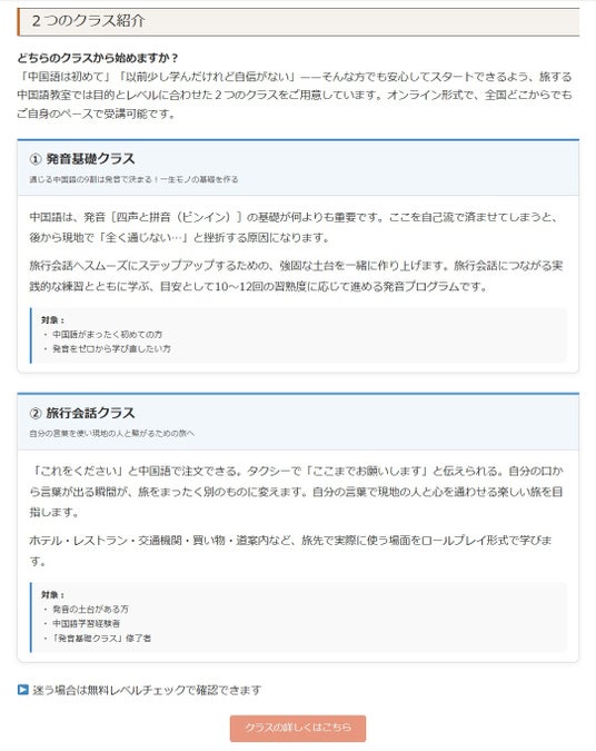「旅する中国語教室」では、レベルに合わせて選べる次の2つのクラスをご用意しており、旅行会話クラスは、受講スタイル(個人レッスン/グループレッスン)をお選びいただけます。