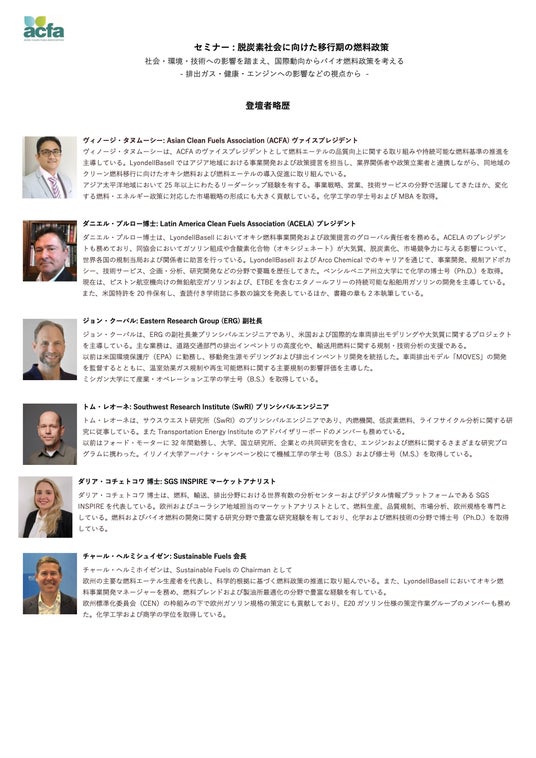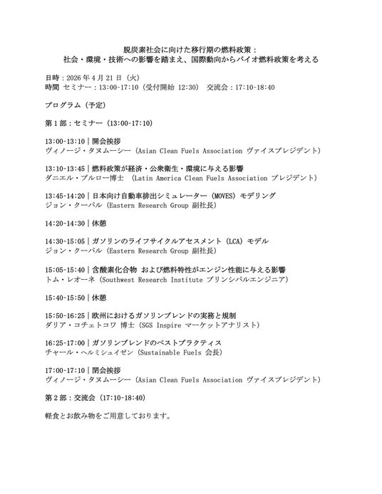 クリーンで効率的な燃料供給を通じた大気質の改善や脱炭素化を推進する非営利団体Asian Clean Fuels Association*(ACFA)は、バイオ燃料の国際動向や燃料政策の方向性をテーマとしたセミナーを、4月21日(火)に、東京・赤坂にて開催いたします。