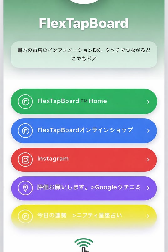 FlexTapBoardは、スマートフォンをかざすだけで、施設案内、多言語ページ、予約ページ、SNS、公式サイト、Googleマップなど、必要な情報へスムーズにアクセスできるNFC案内サービスです。