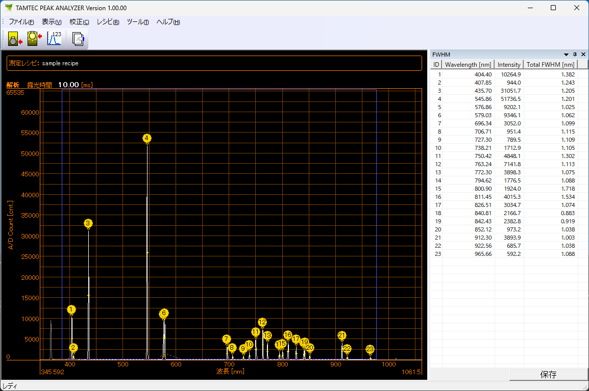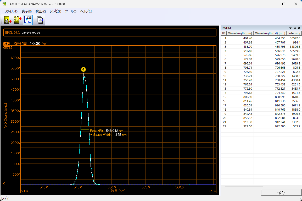 メイン画面。複数ピークの自動検出とFWHMのリアルタイムリスト化