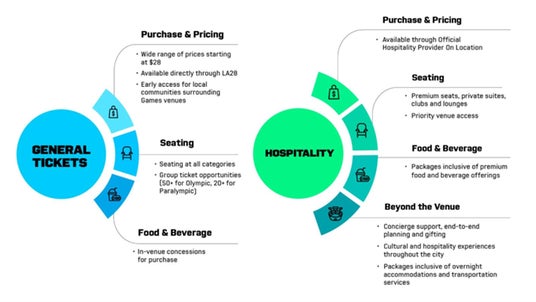 すべてのLA28ホスピタリティ・プログラム・パッケージには、希望するオリンピック競技またはイベントセッションへのチケットが確保されるほか、会場内でのホスピタリティ体験も含まれています。公式ホスピタリティ・パッケージの販売がLA28大会期間中を通じて継続的に行われ、オリンピックチケットの確実な入手が可能となります。また、LA(ロスアンゼルス)およびOKC(オークランドシティ)へのチケット先行販売も実施されました。ホスピタリティなしのオリンピック競技イベント公式チケットは、la28.orgにおいて、LA28のニュースレターに登録し、今後のチケット抽選に関する情報を受け取ることができます。