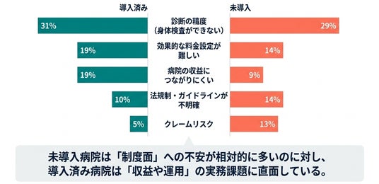 「診断の精度(身体検査ができない)」が、導入済み(31%)、未導入(29%)ともに共通して高い課題として認識されています 。