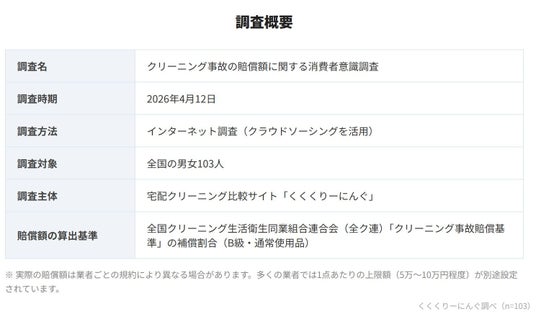 宅配クリーニング比較サイト「くくくりーにんぐ」(https://cccleaning.jp)は、クリーニング事故が起きた場合の賠償額に関する消費者意識調査を実施しました。全国の男女103人を対象に「自分の一番高い服がクリーニング事故に遭ったら、いくら返ってくると思うか」を尋ね、全ク連(全国クリーニング生活衛生同業組合連合会)の賠償基準に基づく実際の賠償額との差を調べました。