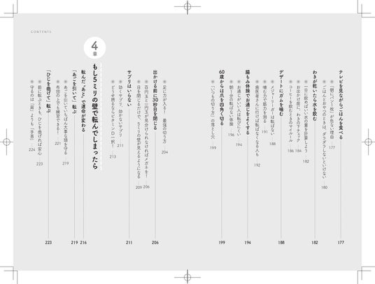 また、寝たきりになる原因のうち、自分で予防できるものとして最も多いのが「転倒」であることから、著者は「人生後半で最も重要なのは、転ばないこと」だと考えています。