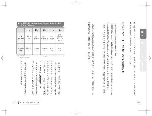 さらに、100円グッズを活用した自宅環境の工夫や、転びにくい靴の選び方、食事・水分補給のポイントなど、日常生活で取り入れやすい対策も紹介しています。