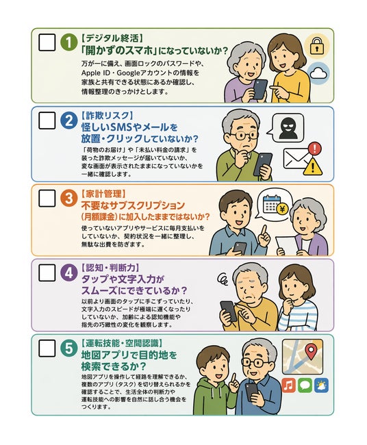 親のスマホを一緒に見ながら、以下の項目を確認してみましょう。これはスマホのスキルを測るだけでなく、認知機能の変化や生活リスクにいち早く気づくためのバロメーターとなります。