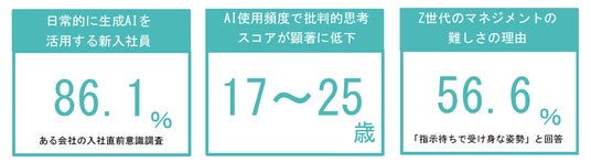 人材採用・育成においては、これまでも価値観の多様化によるその難しさは叫ばれていましたが、AI時代はこれまで以上に若手社員が指示待ち(答え待ち)の受け身姿勢になりやすい状況です。すでに企業側の75%がZ世代のマネジメントに難しさを感じ、その最大の理由(56.6%)として「指示待ちで受け身な姿勢」を挙げています※4。
