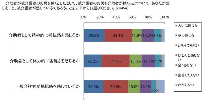 排泄後のお尻を拭き取るロボットを開発中の大阪府豊中市の(株)岡田製作所(http://robot-benza.com/)は、家庭・施設・病院で現在介護を行なっている方(454名)を対象に、ネットアンケートを実施した。(アンケート期間:2016年8月)