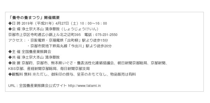 全国畳産業振興会(本部:京都市南区/会長:藤井健司)は、4月29日の春の「畳の日」を機に開催する記念行事として、「畳寺の畳まつり」を、4月27日(土)、“畳寺”こと浄土宗大本山 清浄華院にて開催します。
