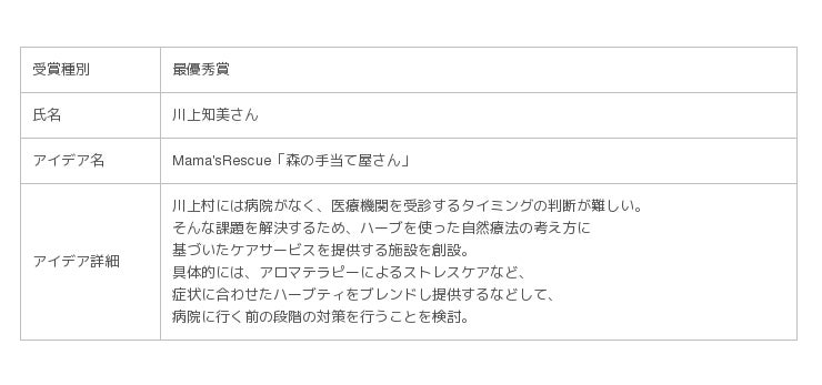 「川上村の皆様、特に女性の皆様の様々なアイデアを拝見して大変参考になりました。大賞を受賞された『森の手当て屋さん』につきましては、母親ならではの細やかな気遣いと、農村ならではの自然環境が融合された素晴らしいコンセプトと感じます。