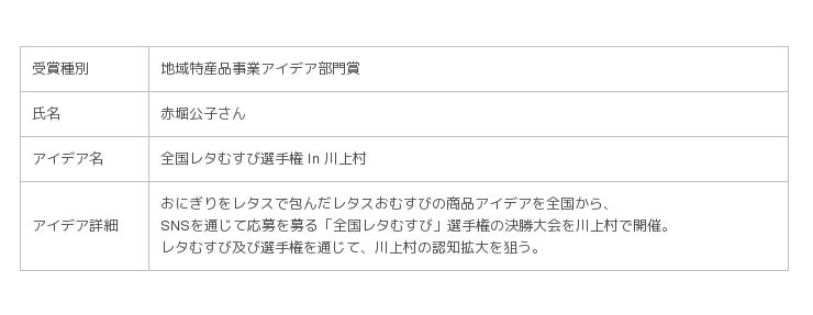 「応募期間が大変短かったが、その間に106件の応募があったという事だけでも、いかに川上村が注目されているか、ということの証ではないかと思います。そして、地元の産品を生かして商品を開発するアイデア。これは、「さるなっしーでラッシー」、あるいは「川上ガレット」「片手DEサラダ」「レタむすび」「ソトノハ入浴剤」。すべてこの地元の産品を活用しようとするアイデアにあふれていて、これは今回受賞にはもれていたとしても必ず実現できるような、アイデアばかりだと私は考えています。