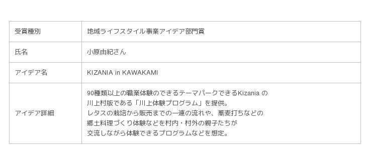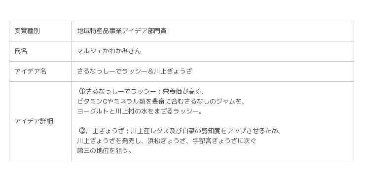 最終審査会では、1次審査を通過した8点のアイデアがプレゼンテーションされ、その結果、「最優秀賞」は、『Mama’s Rescue「森の手当て屋さん」』を考案した川上知美さん、「地域特産品事業アイデア部門賞」は、『さるなっしーでラッシー・川上ぎょうざ』を考案したマルシェかわかみさん、ならびに、『全国レタむすび選手権』の赤堀公子さん、「地域ライフスタイル事業アイデア部門賞」は、『KIDZANIA in KAWAKAMI』の小原由紀さんが選出されました。