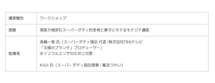 また、コンテスト開催当日には、審査委員であるライフスタイルプロデューサーの村上萌氏のワークショップや、(株)ローソン農業推進部部長の下澤洋氏の講演、「地方創生と女性の社会参画」をテーマとした審査委員によるパネルディスカッション、スーパーダディ協会理事のKOJI氏による講座も開催致しました。