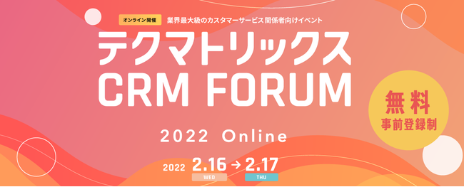 テクマトリックス株式会社 (本社:東京都港区、代表取締役社長:由利孝、以下「テクマトリックス」) は、カスタマーサービスの業界動向や最新ソリューション、導入事例を紹介する日本最大級のカスタマーサービス関係者向けイベント「テクマトリックスCRM FORUM 2022 ~ヒト×テクノロジーで次の未来へ~」を、2022年2月16日(水)・17日(木)の2日間、オンラインで開催します。