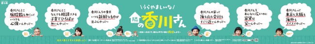 デザインのコンセプトは、キャッチコピー「うらやましいな 隣の香川さん ~日本一小さくて、暮らしやすい県に移住しよう~」のとおり、ある家族が、香川に移住した元隣人の「香川さん」の香川での暮らしぶりを羨ましがっているリアルな会話を再現し、それぞれのかがわ暮らしの特長に関するコメントにより、「香川への移住の魅力」の認知向上を図るものです。
