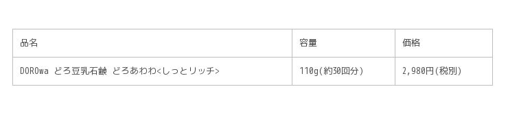 通常品「どろあわわ」(110g 単品購入価格2,980円(税別))は、マリンシルト*3とベントナイト*3の2種の天然の吸着泥が毛穴汚れや古い角質をごっそり落としつつ、豆乳発酵液*4、コラーゲン*4、ヒアルロン酸*4、黒砂糖エキス*4などの保湿成分配合でしっとりなめらかに洗い上げる洗顔料。もっちりとした泡立ちで多くの支持を集めています。