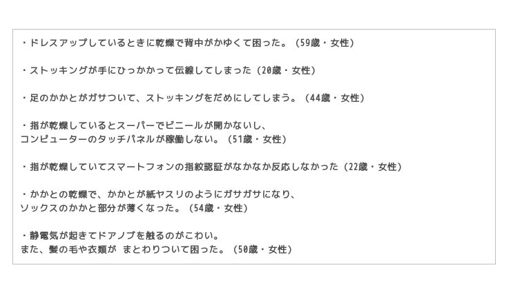 肌の乾燥で困ったエピソードの中で、具体的なものをいくつかピックアップしました。「タッチパネルが稼動しない」「ビニール袋を素手で開けない」など、生活の中でのちょっとしたエピソードや、「ストッキングをダメにしてしまう」のような、女性ならではのエピソードが多く見られました。