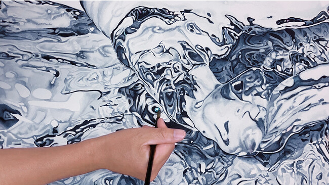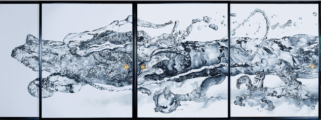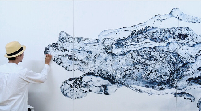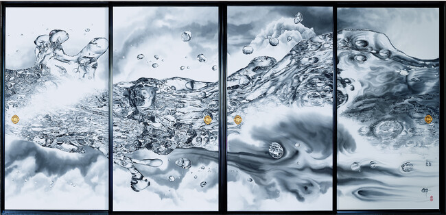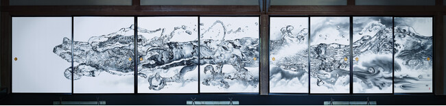彼は水を司る神の姿を、人々に恵みを与える「清らかな水」そのもので表現したいと考え、日本の古典的な様式美を踏襲せず、類例のない、新たな様式美へと更新させました。作品右側の嵐は現在の困難な社会情勢(コロナや世界の紛争)を表現し、一方で、作品左側の空白は光を表しています。これは「全人類が明るい未来へ向かうように」という作者の願いを込めています。この襖絵は永続的に年に一期間公開される予定。100年、200年と受け継がれることでしょう。