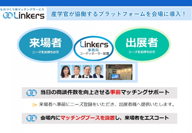 リンカーズコーディネーターが、ご来場いただく皆様からの技術的な相談、実現可否、販路開拓先の候補など