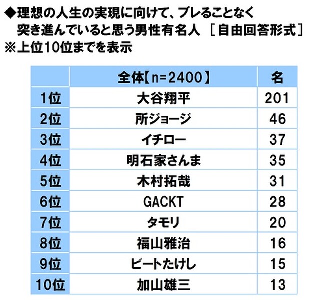 理想の人生の実現に向けて、ブレることなく突き進んでいると思う男性有名人 1位「大谷翔平さん」、2位「所ジョージさん」、3位「イチローさん」