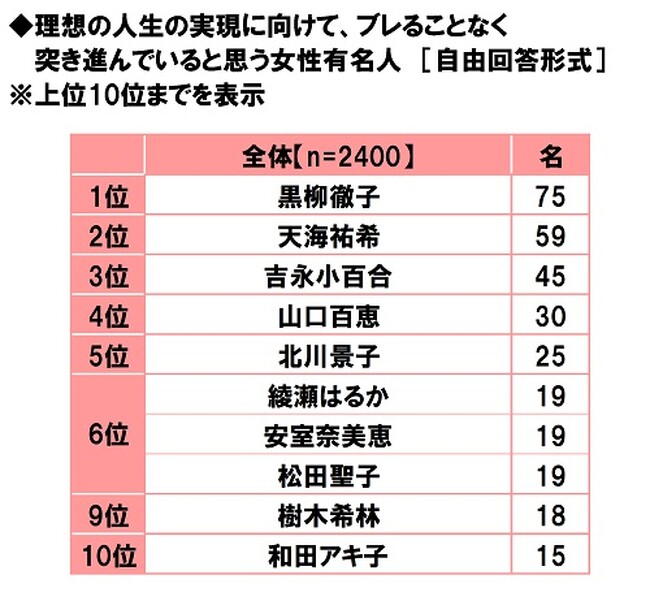 理想の人生の実現に向けて、ブレることなく突き進んでいると思う女性有名人 1位「黒柳徹子さん」、2位「天海祐希さん」、3位「吉永小百合さん」