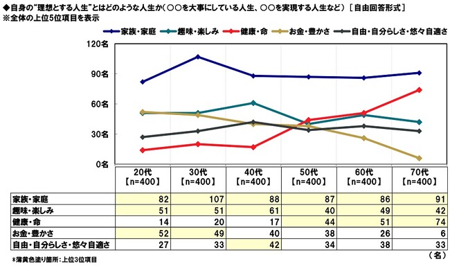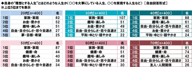 具体的な内容をみると、1位の「家族・家庭」では「大切な家族と楽しく過ごす人生」「自分の家族のために生きる人生」「家族を大切にする人生」「子どもたちの幸せを願う人生」といった回答がありました。また、2位の「趣味・楽しみ」では「趣味を満喫する人生」「好きなことをして生きる人生」「活き活きと楽しく生きる人生」、3位の「健康・命」では「いつまでも健康であり続ける人生」「健康で活き活きした人生」「心身ともに健康な人生」、4位の「お金・豊かさ」では「お金に困らない人生」「経済的自由を獲得した人生」、5位の「自由・自分らしさ・悠々自適さ」では「自由な時間を確保できる人生」「思い描いたとおりに生きていける人生」といった回答がありました。