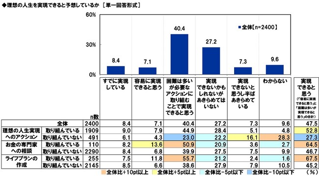 また、“ライフプランの作成”に取り組んでいる人では『実現できると思う』は67.5%と、“ライフプランの作成”に取り組んでいない人(45.2%)と比べて22.3ポイント高くなりました。