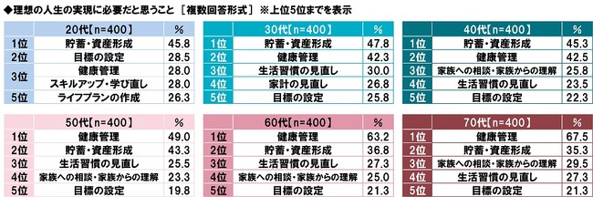 理想の人生の実現に必要だと思うこと 1位「健康管理」、2位「貯蓄・資産形成」、3位「生活習慣の見直し」