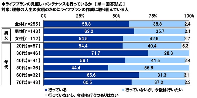 理想の人生の実現のためにライフプランを作成している人の58.8%が「ライフプランの見直し・メンテナンスを行っている」と回答、30代では71.7%