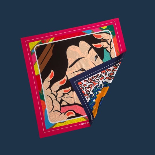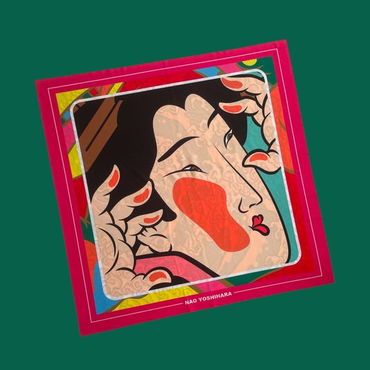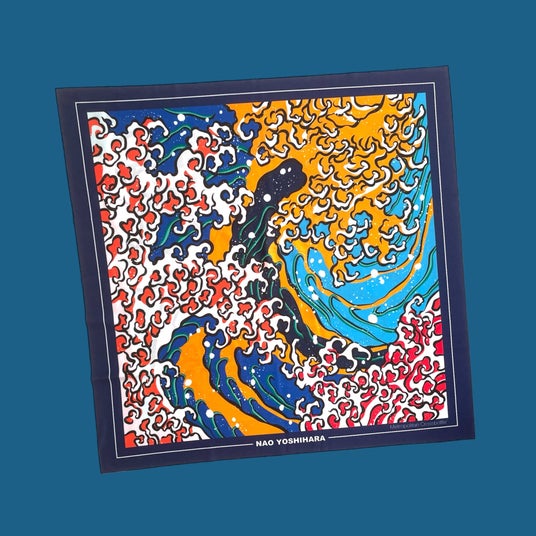 55cmx55cmは「Inlaid」片面は女性がショーウインドウをのぞいているかのような愛らしい表情が55cm角いっぱいに描かれている。もう片面は浮世絵の波がNAOのタッチでダイナミックに描かれている。クロスをスカーフとして使うときに、どこの部分のデザインを出すのかで全く違う雰囲気を演出できるので、その日の気分やファッションによって楽しめそうだ。55cmはバンダナサイズとなっており、楽器を拭いたり、PC画面を拭いたりグラスを磨いたり、車ボディやナビ画面・バイクのヘルメット、そしてゴルフクラブを磨くのに最適なサイズとなっている。まさに誰もが使える、楽しめる、多くの自由を手にしたアートファブリック。是非、とらわれない自由な発想でアーティスティックに楽しみたい。こちらのコラボレーションコレクションは限られたメトロポリタンクロスボトルお取り扱い店舗、メトロポリタンクロスボトル公式サイトにてご購入可能となり、日本を含むアジアでは 6 月 15 日より発売をスタートし、アメリカ、イギリス、ヨーロッパでは、6 月 22 日より発売される。