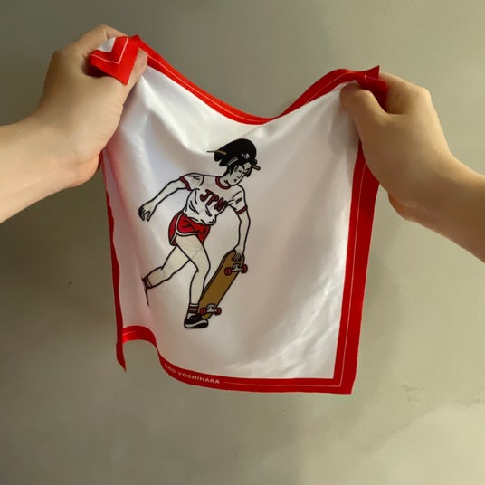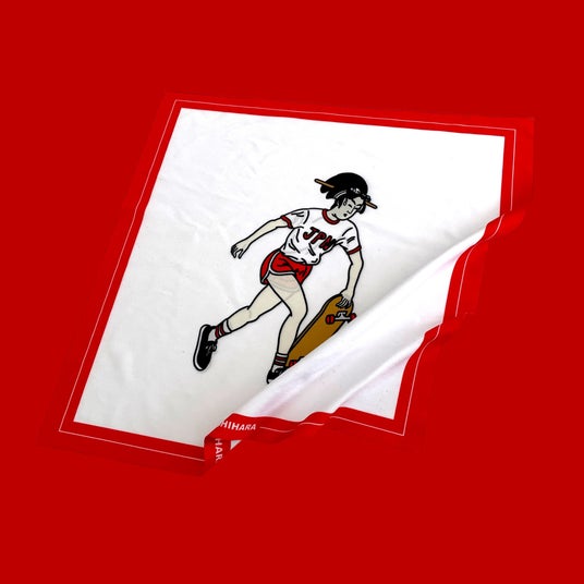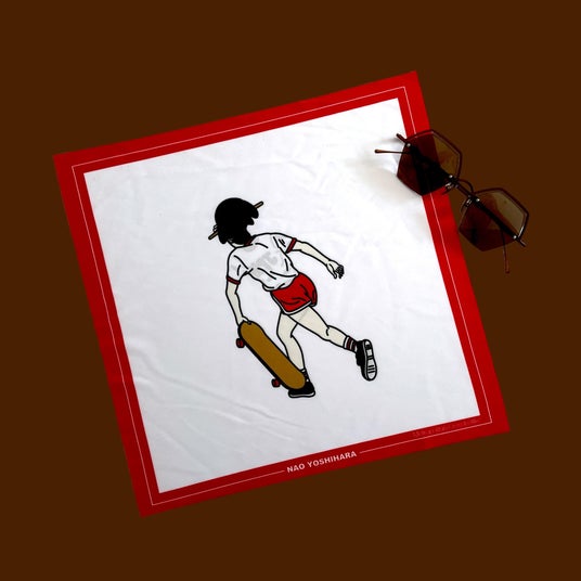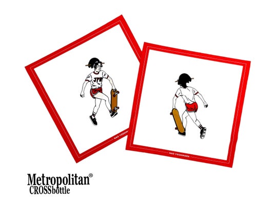 30cmx30cmは「Start to run」表面と裏面で女性がスケボーに乗りはじめる姿のまさに真正面から見た姿と後ろから見た姿で構成されている。メトロポリタンクロスボトルのダブルフェイスの特徴を活かした心躍る作品となっている。30cmはちょうどハンカチーフサイズ。携帯を拭いたり、メガネ・サングラスを拭くのに最適なサイズ感です。