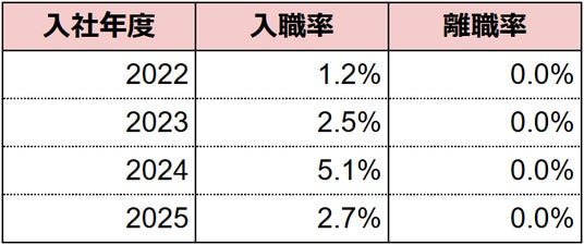 銀座英國屋では、右記データが示す通り、過去3年間、入社3年以内の離職率がゼロという特筆すべき実績を維持しています。