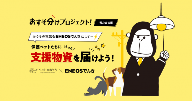 このような背景から、低価格での電力提供に定評のある「ENEOSでんき」が、「おすそ分けプロジェクト」への参加により、ペット飼育者の光熱費負担軽減と保護犬・猫への支援を同時に実現したいと参加を申し出てくださいました。