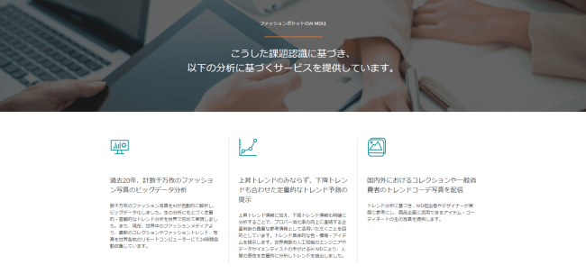 同社は世界中のメディアにおける大量のファッションビッグデータ画像をAIにより自動的に種別分類・評価することで、これまで感覚や定性情報に基づいていたファッションやコーディネートのトレンド情報を定量化し、人間のファッションに関する感性を可視化することに世界で初めて成功しています。これまでにも、AIを用いた画像解析技術を活用し、ファッションのトレンドやコーディネート予測、アパレル企業の商品企画・MDの最適化などのAIシステムサービスを大手アパレル企業に向けて提供してまいりました。こうしたファッショントレンド予測の経験や知見を活かし、日々増え続ける数千万枚以上のAIビッグデータから抽出されたファッショントレンドの骨子をショートサマリーとレポートにまとめ上げ定期購読いただけるようレポートサービス化したものが同サービスです。