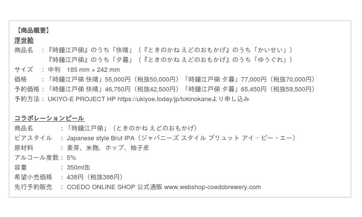 株式会社三井ミュージック(代表取締役社長・三井悠加)が手がける浮世絵の企画・制作・販売を行うUKIYO-E PROJECTは、『江戸のおもかげ』シリーズの2作品目となる浮世絵「時鐘江戸俤(ときのかね えどのおもかげ)」の予約販売を6月21日(月)から開始します。また、日本を代表するクラフトビールメーカーの株式会社協同商事コエドブルワリー(代表取締役社長・朝霧重治)は「時鐘江戸俤」をテーマとしたコラボレーションビールを7月7日(水)より発売します。