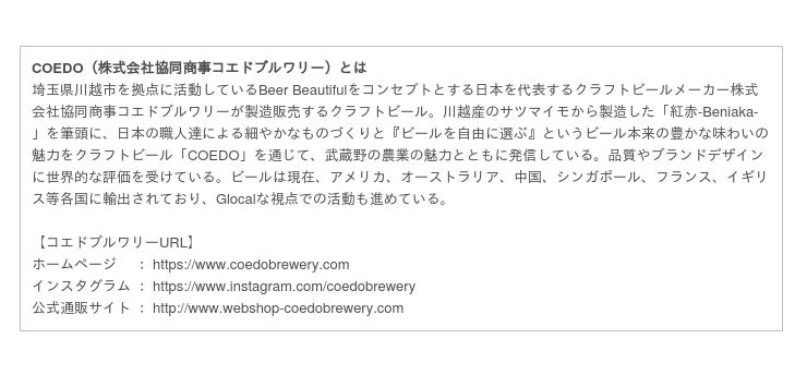 株式会社協同商事コエドブルワリー 代表 0493-39-2828 info@coedobrewery.com