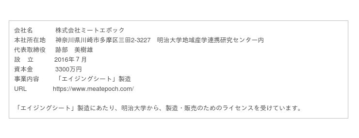 株式会社ミートエポックでは、肉の熟成に利用できる人体に無害な“菌”を純粋に培養し、回収した胞子を滅菌した布に付着、この布が「エイジングシート」です。「エイジングシート」の製造技術は、株式会社ミートエポックと明治大学が共同で特許を取得しております。