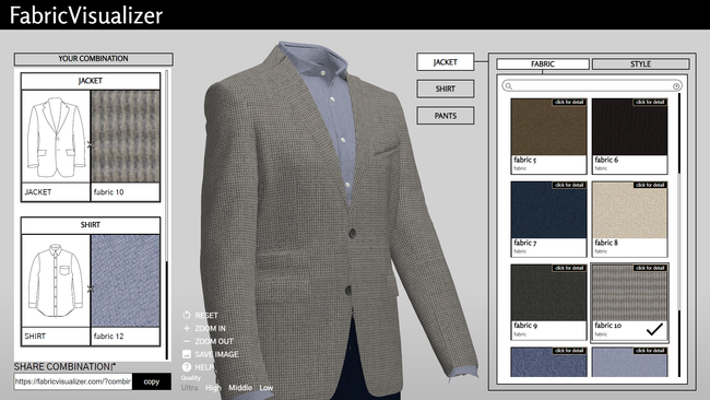 『Fabric Visualizer』(デモ版:https://fabricvisualizer.com)は、web上に3Dの衣服を表示し、生地のスキャンデータを簡単に貼り付け、差し替えられるwebアプリです。